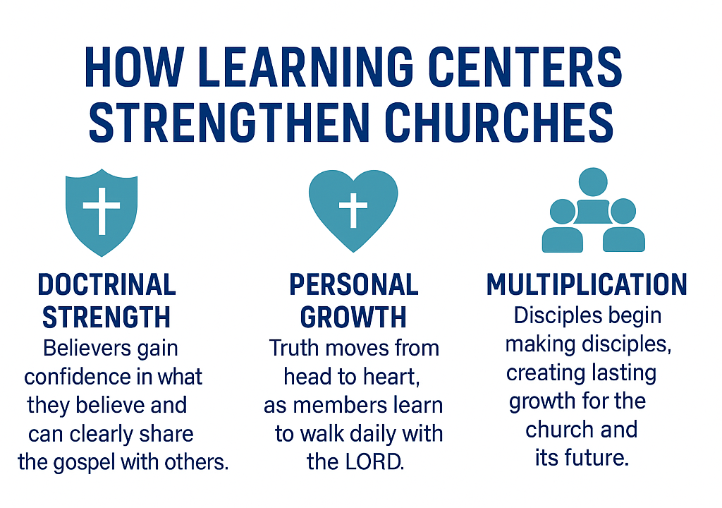 The solution? Learning centers are structured ministries within the church designed for deeper discipleship. These centers won’t replace Sunday school but will provide an alternative for believers who desire a richer understanding of Scripture and the ability to confidently share their faith.